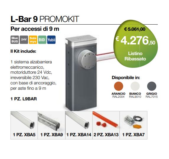 Il Kit include: 1 PZ. L9BAR, 1 PZ. XBA5, 1 PZ. XBA14, 1 PZ. XBA9, 2 PZ. XBA13, 1 PZ. XBA7
