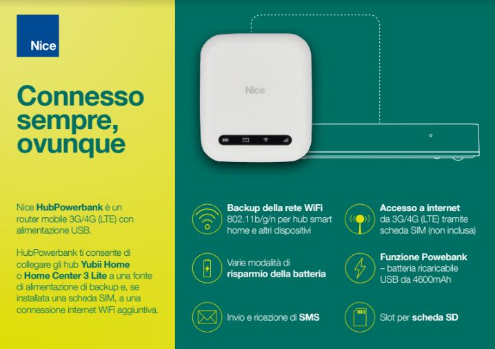 Router mobile 3G/4G (LTE) con alimentazione USB, che consente di collegare gli Hub Yubii Home o Home Center 3 Lite ad una fonte di alimentazione di backup.